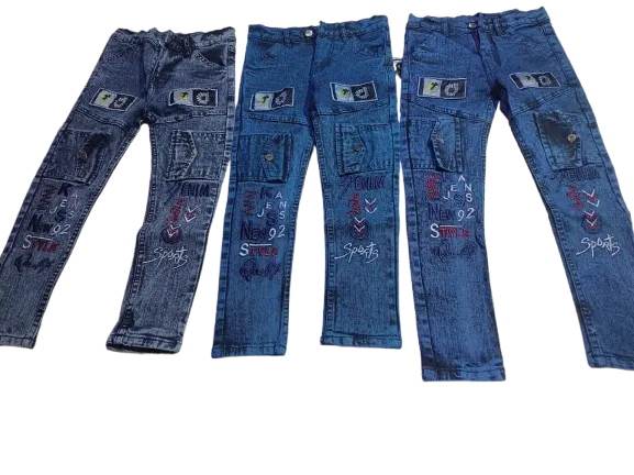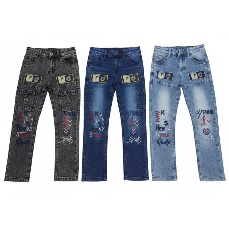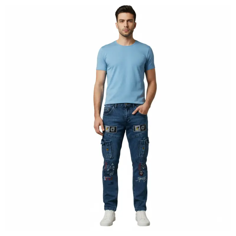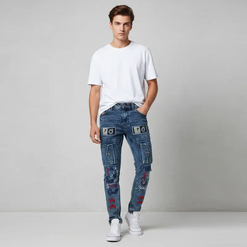 The collection includes three distinct color washes that each have a “full design” aesthetic. From the classic indigo hue to the subtly worn denim, each pair of jeans is decorated with eye-catching patches. Striking designs of red arrows and trendy text components such as ‘DENIM,’ ‘NEW 92,’ and ‘STYLE’ make them stand out from the norm. They are strategically positioned in the front and the back to create a vibrant and trendy look guaranteed to attract attention.